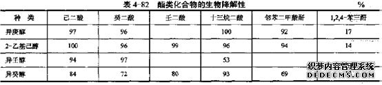 合成飽和酯的生物降解性與其化學(xué)結(jié)構(gòu)有很大關(guān)系。S.J.Kandles對(duì)不同結(jié)構(gòu)的酯類化合物的生物降解性進(jìn)行了研究,結(jié)果見表4-82。可以看出,由同種酸和不同鏈長的異構(gòu)醇反應(yīng)生成的酯類化合物,生物降解性隨支鏈醇相對(duì)分子質(zhì)量的增加而降低。由不同二元酸和同種醇反應(yīng)生成的酯,其生物降解性不隨酸相對(duì)分子質(zhì)量的增加而變化。在酯類化合物中,引入芳環(huán)會(huì)減弱生物降解性。總之,線性、非芳環(huán)和無支鏈的短鏈分子的生物降解性通常較好。由此看來,用作環(huán)境友好潤滑油基礎(chǔ)油的合成酯一般是雙酯、多元醇酯、復(fù)合酯和混合酯。